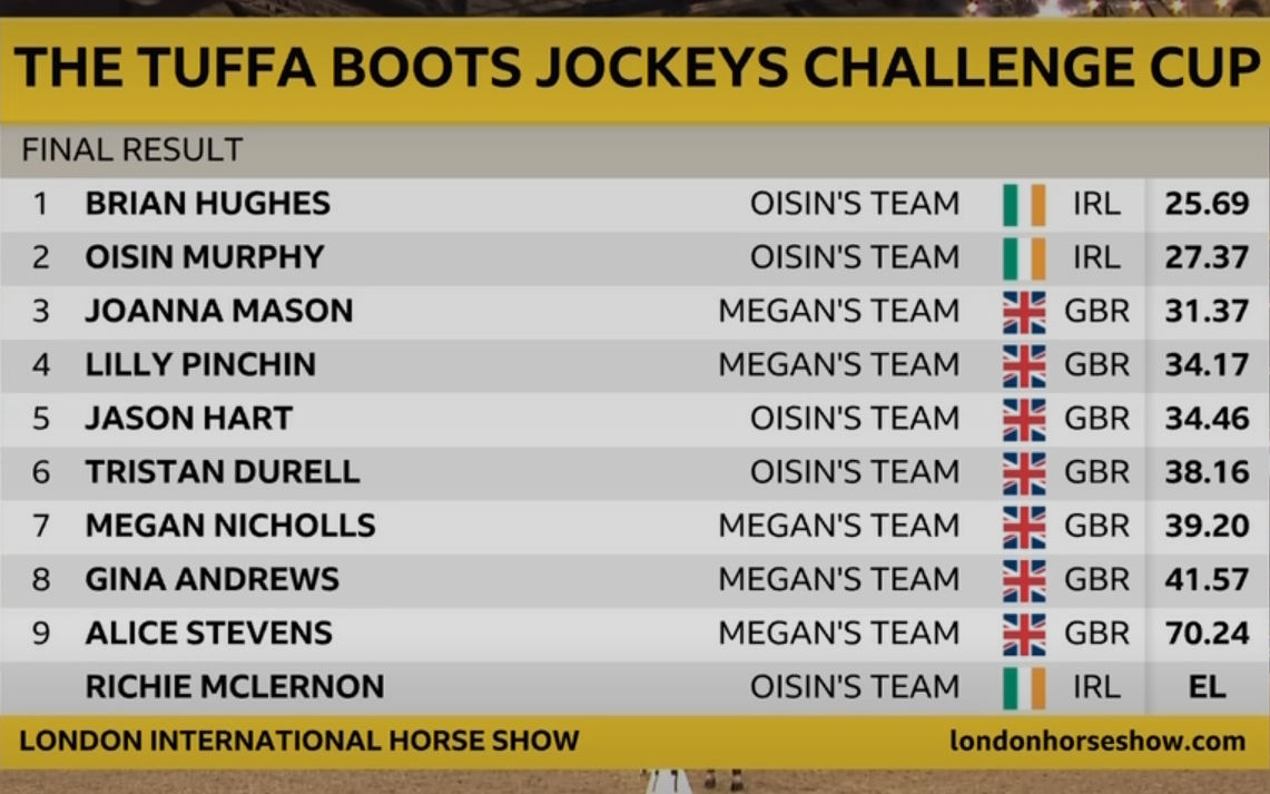 Joanna Mason completed a fantastic round of showjumping this evening at the London International Horse Show to finish third in The Tuffa Boots Jockeys Challenge.