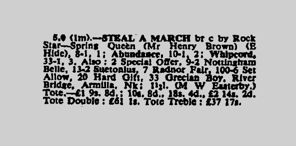 Eddie's plan was executed to perfection as he got Steal A March up right on the line to finish a neck ahead of Jack Waugh's horse, Abundance, and it all happened before Henry had got out his final "Mer-Mer-March".