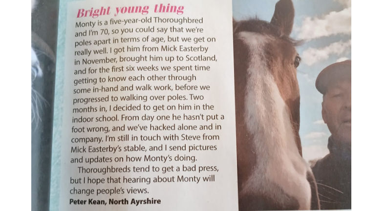 Former Mick & David Easterby sprinter was rehomed last year to Peter in North Ayrshire. Peter has formed a very strong bond with the five-year-old gelding, now known as Monty, and here they are featured in Your Horse magazine this month.