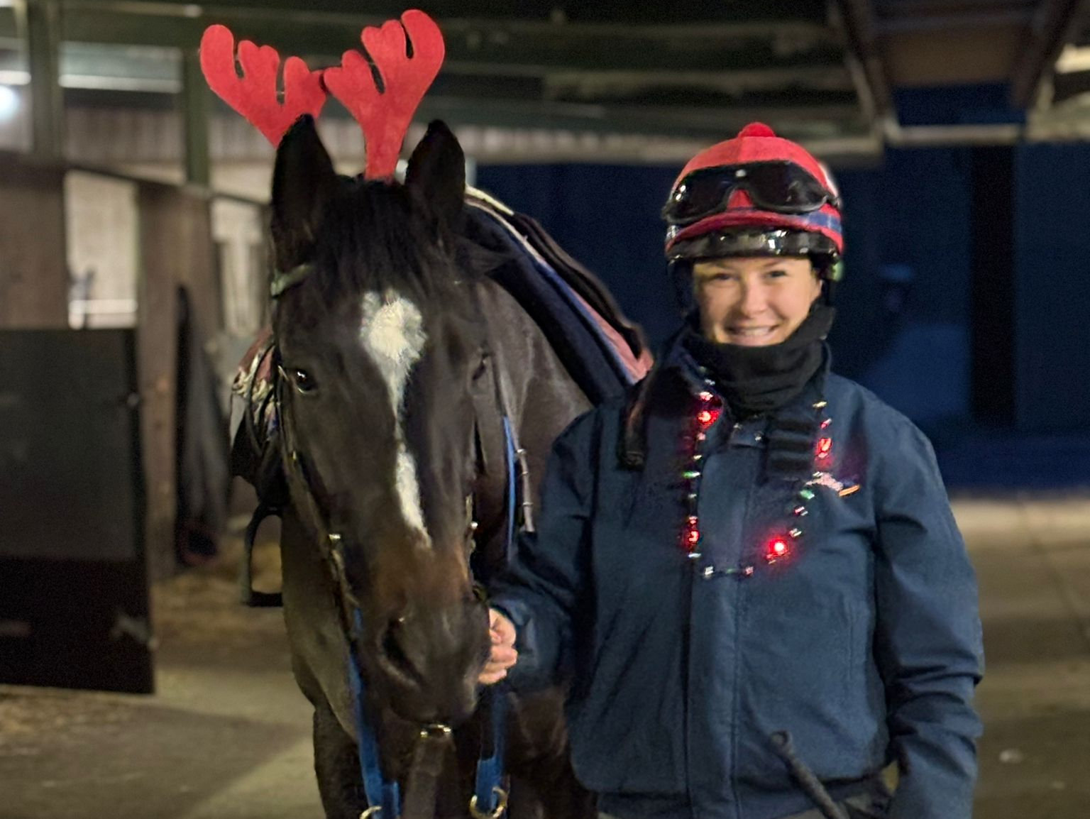 The staff and horses are decked out in Christmas gear today and here's Joanna Mason with a set of lights and two-year-old Rocklaw sporting antlers!